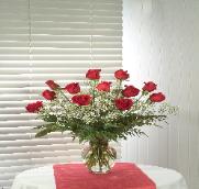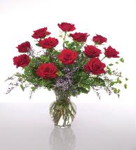 Vase arrangement Dozen Red roses with misty blue, Greens $65.50