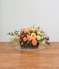 Erf 8600 Basket Arrangement low and wide design gerbera daisy, roses lilys, mix greens,
