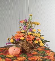 Round Basket arrangement holloween, gerbera daisies, buttons, mix greens, $45.50